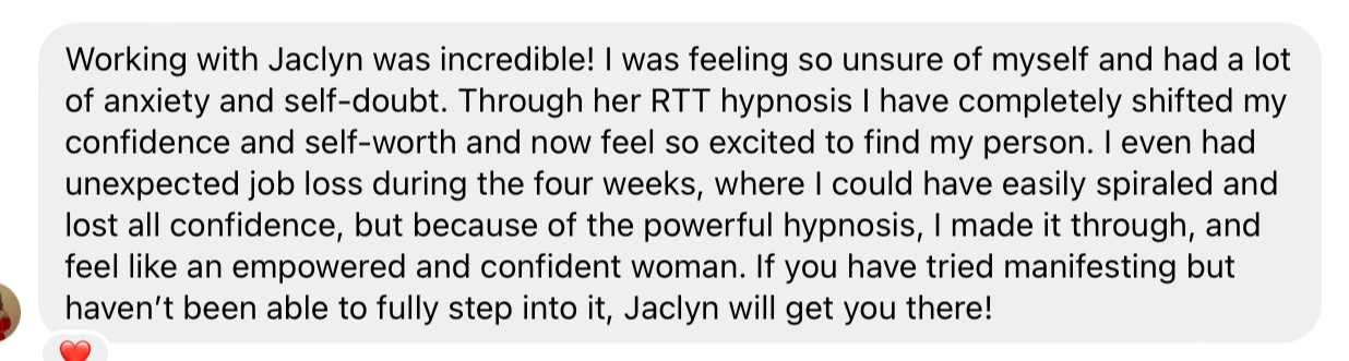 "My ONLY regret is not doing Jaclyn’s RTT session SOONER! My views on dating changed dramatically when she carefully helped to address my limiting core beliefs and rewrite my inner thoughts! The RTT session was incredibly powerful in altering my confidence, self love, self worth and acceptance. This has instantly been reflected in my own thoughts, feelings and actions where I now feel empowered in dating, confident in myself, brave enough to have difficult conversations where I can speak my truth and feeling like I can now CHOOSE and not simply wait to be chosen or act out of fear. Jaclyn and her approach is warm, supportive, honest, relevant, easy and rapid! Don’t walk, RUN! Forever grateful for Jaclyn and this life altering experience xxx"